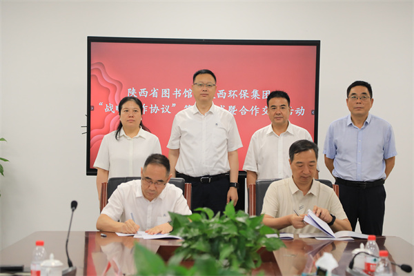 8月14日,陜西環(huán)保集團(tuán)與陜西省圖書館在省圖書館高新館區(qū)簽訂戰(zhàn)略合作協(xié)議。陜西環(huán)保集團(tuán)黨委書記、董事長郝軍亮,陜西省圖書館黨委書記、館長周云岳出席簽約儀式。陜西環(huán)保集團(tuán)黨委副書記、董事、工會主席趙建文,陜西省圖書館黨委委員、工會主席胡竹林分別代表雙方簽署協(xié)議。